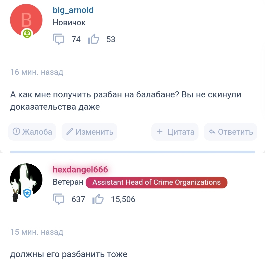 Я благодарю за то что мне заменили айбан на 10 дней, но это было на Арнольде! А на Балабане я пришел , меня шотнули за оскорбление и мне выдали бан
