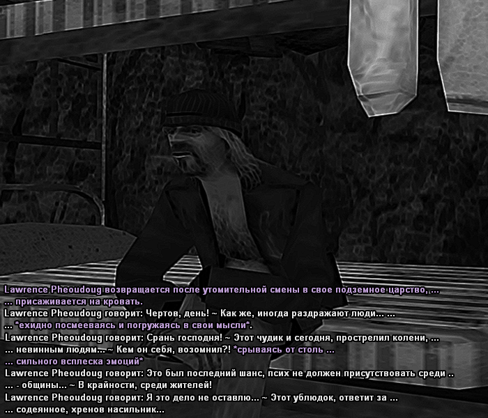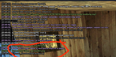 Тут мало что понятно, но судя по началу чата можно понять что наш любимый Хантер прострелил колени очередному зеваке в Брухасе, за что я за ним погнался, он же в свою очередь поджидал меня в салуне и решил нагло накинуться и в конце по просту оффнуться...