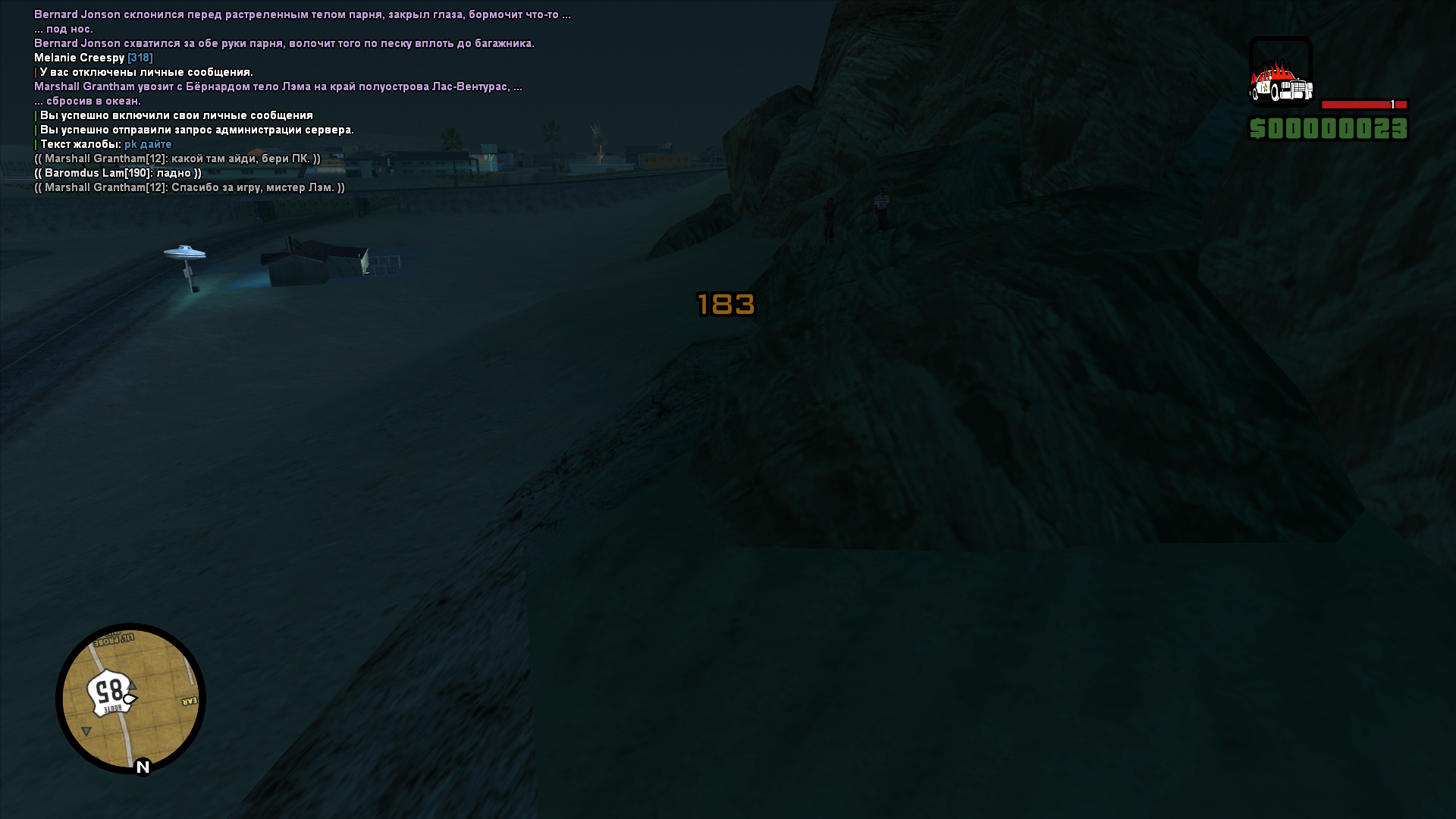 Был убит, и отыгран, что помещен в багажник, и скинут в океан. По приезду двоих игроков Лас-Брухаса, напиздел им что его труп до сих пор лежит, с пулевыми от револьвера. Что спровоцировал масс шот в Лас-Брухасе, по нашему приезду.