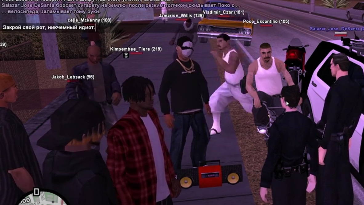 Суть жалобы: ДМ с ипользованием коктейля молотова + офф с ситы обоих(поко считай офф от ареста, джамарион оффнулся после того как кинул молотов), это уже не первый случай такого дма и убийства без причин, сама фракция играет непонятно что, к игрокам подходят полицейские и те сразу начинают быковать, кричать мол ''валите с нашего района, тупые копы'', перед человеком стоит коп - женщина и он выдает фразу ''кончил бы на лицо'', абсолютно непонятная и бесполезная фракция, и игроки ее такие же. ТИПЫ обыгрывают что живут наверное в какой то бразилии 70ых годов, а не в США 24 года, для них нормально средь бела дня убить копа на оживленной улице, хотя висят камеры на столбах, есть боди камеры и регистратор. Людям в этой фракции вообще плевать что в современной Америке никакой черный не подойдет к копу и не скажет ему ''ты че тут забыл, тупая свинья, вали к своему шефику под стол''. Это полный идиотизм и лицемерие.