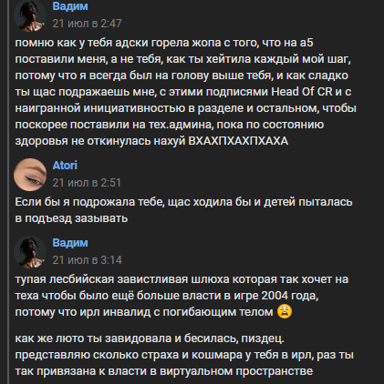 Хочу посмотреть, где были "неоднократные оскорбления администрации", кроме моей словесной перепалки с Рамилем Рамилевым и выписываний пару бредятин атори. Кого я там на постоянной основе оскорбляю? И как вообще за переписку в вк можно сносить личный кабинет?