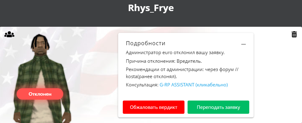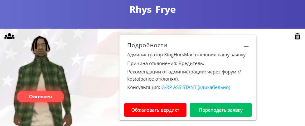 kosta отклоняет мне персонажа потому что видит на один бан больше чем есть на самом деле. Ему пишешь что бана было два, а после разбана стал один. Он все-равно видит на один бан больше.