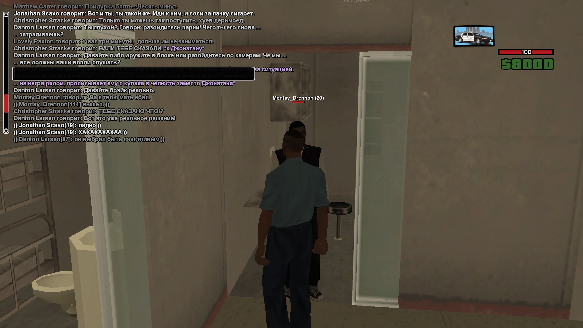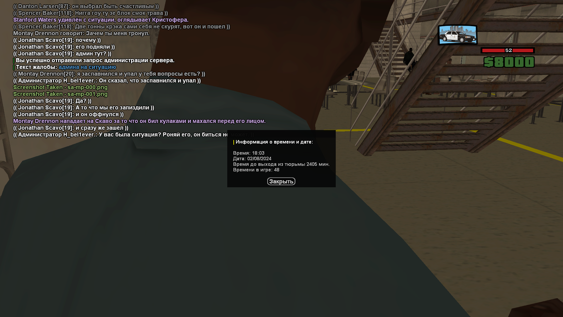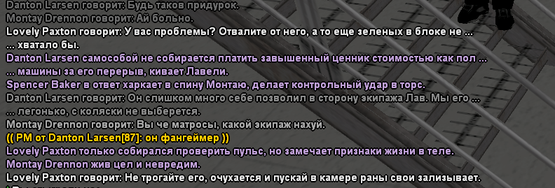 Суть жалобы: Была ситуация, где этого парня избили и уронили в стадию. Он сразу же оффнулся, а затем заходит спустя минуту, и я вижу как хелпер его поднимает. Я прихожу спрашиваю мол зачем подняли, а он говорит "Я зашёл и упал в стадию, вот и подняли", а потом резко нападает на меня не понятно за что. В общем парниша оффнулся от игры а потом ещё вдобавок и хелпера наебал. Думает что самый умный)