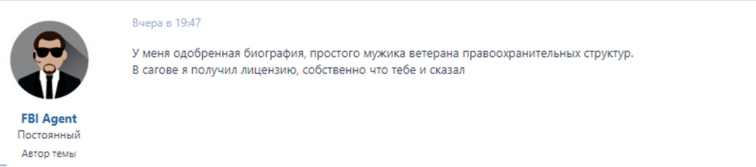 Выдавали мне его на отыгрыш моей роли и атмосферы, бывшего агента ФБР, который ветеран в правоохранительных структурах, оказывает консультирование и передачу опыта и ВСЁ. Так же я являюсь охотником за головами, но это только частная практика и не более того. (с)