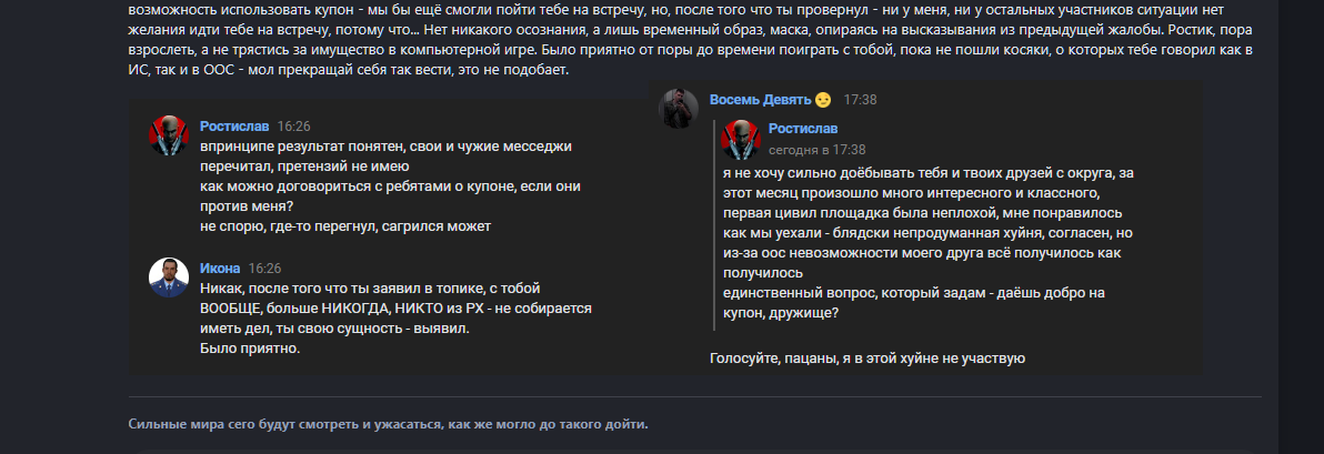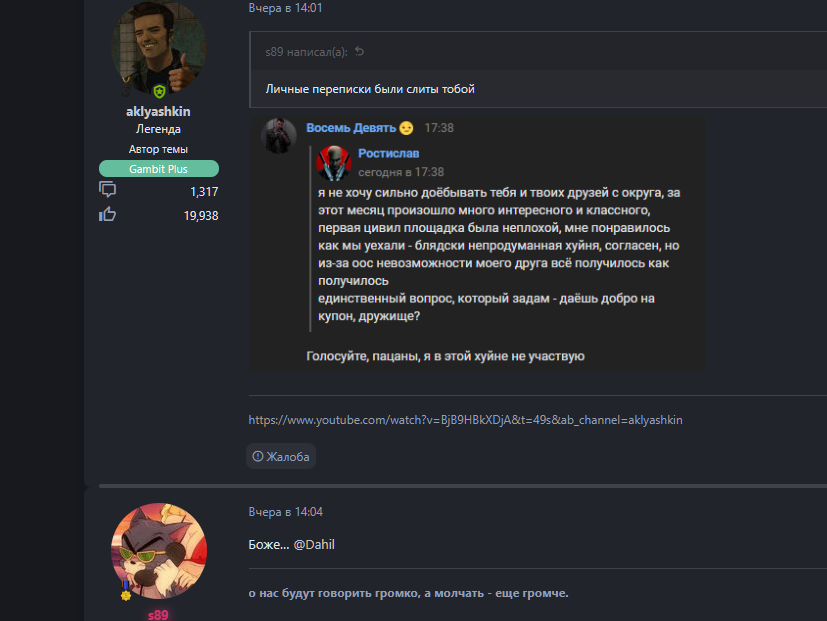 S89 (бывш. stepa) - Закрывает жалобы до ответа, не дав контраргументов на его аргументы. Данный администратор имеет право сливать личные переписки? Я так не думаю. Он взял мои сообщения, как и ассистент с форумным ником NK0HA, и слил их без моего разрешения. Попросил бы он у меня его - я бы дал добро на показ этого в жалобе. Он также утверждает, что переписки были слиты именно мной, но на контраргумент в виде его же скриншота, где он её сливает другим, он просто пишет: