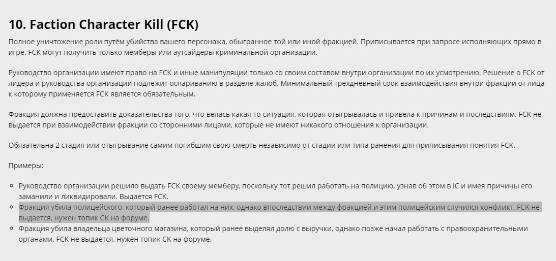 Полное уничтожение роли путём убийства вашего персонажа, обыгранное той или иной фракцией. Приписывается при запросе исполняющих прямо в игре. FCK могут получить только мемберы или аутсайдеры криминальной организации.