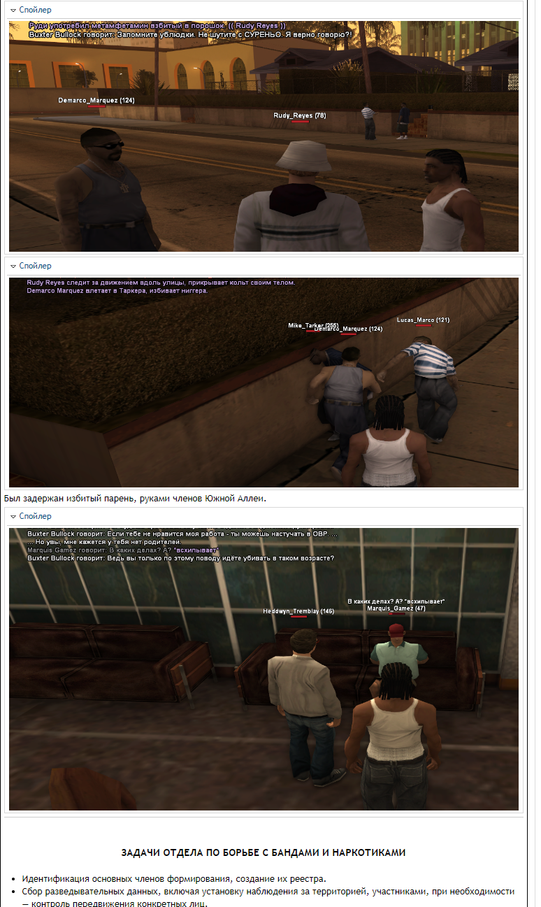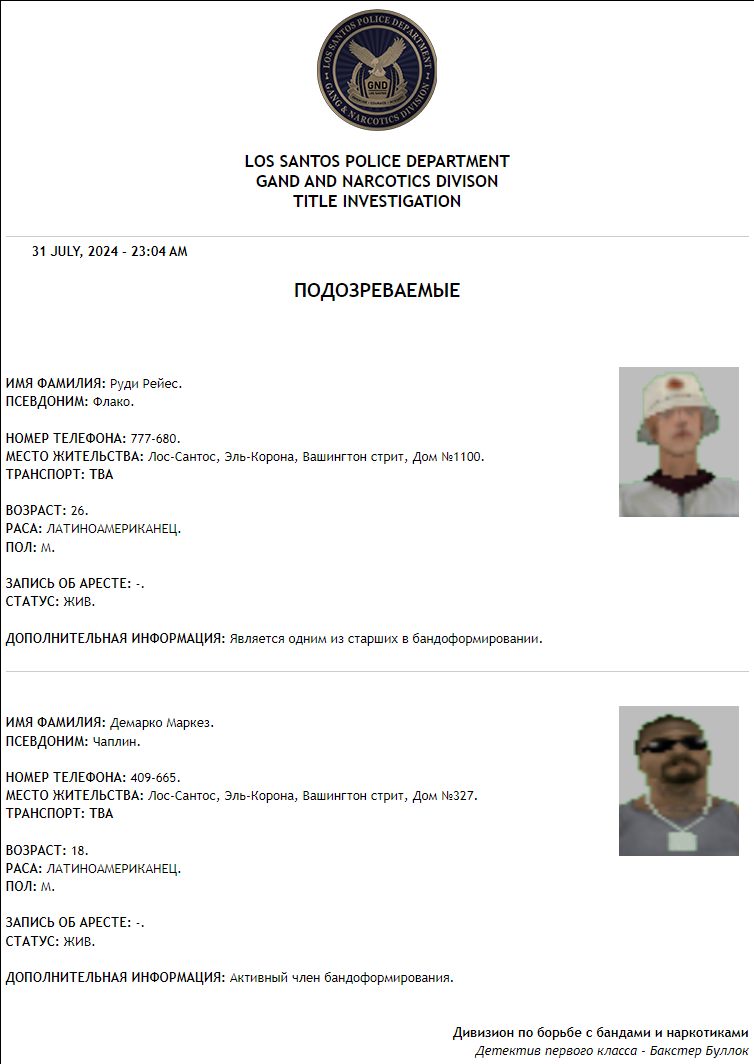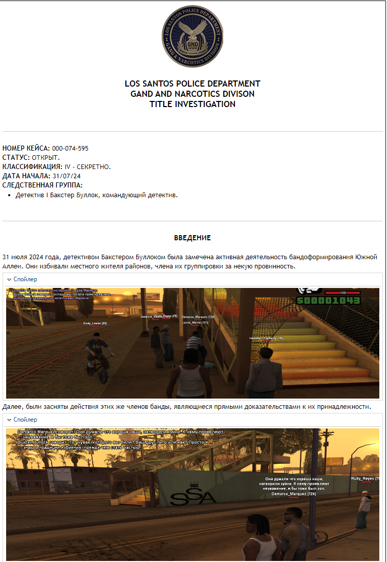 По мимо всего у меня есть претензия к отделу ГНД: ребят вы серьезно считаете это кейс файлом? Походить в толпе бандосов, написать рукой что зафиксировал это, это, пятое десятое, без процедур дознания (ебло сфоткать еще не означает получить полную картину об нарушителе), без тех же экспертиз - это ваш уровень игры? Я считаю это мягко скажем дерьмом. Игрок Buxter Bullock тупо походил в толпе, написал в кейсе что он там что-то поснимал, и все, у него уже есть некоторые ключевые подозреваемые. А экспертизы, допросы там, поиск информации, работа с информаторами, улицы? Да хотя бы прогнать его ебло по прошлым судимостям или базе водительских прав.