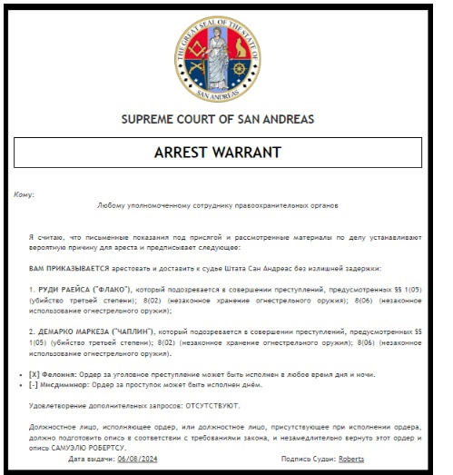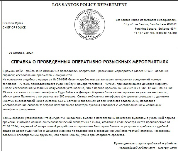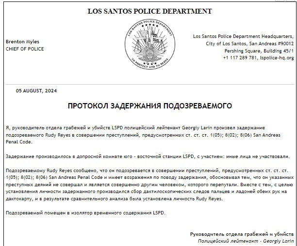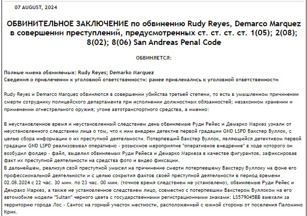 Значится Rudy Reyes , он же мой подзащитный, он же лидер фракции оффки, написал жалобу на начальника РХД ЛСПД в связи с тем, что отпечатки которые ему написали детективы, недействительны по причине того, что у детективов нет ООС части против Рудика. Нет скринов как Рудик заряжал свой пистолет по пульке - нет отпечатков пальцев, в ином случае это игра в свою пользу от РХД ЛСПД, так думал Рудик, писав жалобу вот эту: