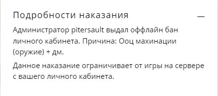 Суть жалобы: привет. отдыхал от гамбита где-то недели две, после дня, когда я зарезал с бензопилы чела и ушёл в пк, увидел ещё тогда, что мой лк в бане, но признаться честно, я на тот момент устал и мне было всё равно, я и покинул сервер, думая "похуй потом обжалую". сейчас хочу поиграть, готов ответить на все вопросы по поводу дма (его не было). во первых, эдуард какой-то там начал по мне стрелять первым, я его и зарезал с бензопилы, а потом меня застрелили его друзья. потом, мой (на тот момент) товарищ устроил масс дм пока я был в стадии и передал мне ствол. его сразу забанили, а под копирку отправили и меня.