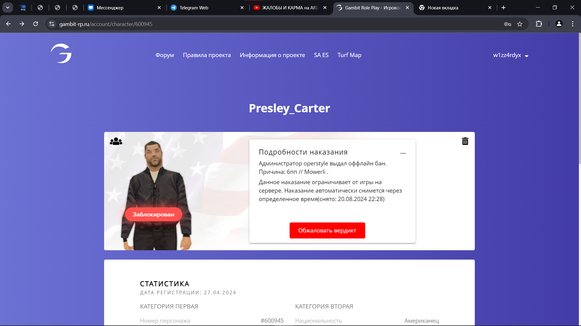 Дата и время наказания/нарушения: 15 Авг 2024
