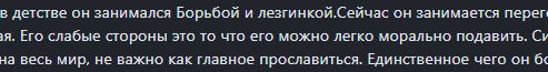 Залимхан обычный парень из Дагестана. Ранне в детстве он занимался Борьбой и лезгинкой.Сейчас он занимается перегоном машин. Залимхан в Дагестане был самым добрым человеком и часто помогал людям которым была нужна помощь физическая либо моральная. Его слабые стороны это то что его можно легко морально подавить. Сильные стороны у него это то что он умеет хорошо водит машину, и смышлёный. Страхов у Залимхана почти нету. Мечта Залимхана это прославиться на весь мир, не важно как главное прославиться. Единственное чего он боится это потерять своих родных-близких. Хобби у него это вести туры по горам. Залимхан часто бывает на свадьбах са своим братом Русланом, и танцует там лезгинку. Отношение к обществу у него положительное, он любит поговорить с кем то. Поведение Залимхана на людях адекватное, но он старается казаться крутым. Залимхан чистоплотный парень он не любит когда в его комнате беспорядок. Когда на Залимхана лезут с плохими намерениями он сразу делает проход в ноги и валит противника на удушающий. Характер у него очень переменчивый на пример он может быть добрым, но если кто то что то скажет про него либо про его семью то Залимхан приходит в ярость и начинает душить обидчика пока тот не извиниться перед ним. У Залимхана герпетофобия (боязнь рептилий, змей). Привычки у Залимхана только полезные, вредных нету. Из полезных привычек у Залимхана это соблюдение гигиены и убирать за собой, например когда поел он сразу убирает за собой. В экстренной ситуации Залимхан не станет паниковать, а наоборот станет помогать людям и найдет выход из любого положения.. Положительные качества Залимхана это: доброта и умение сказать правду. Отрицательные качества Залимхана это то что он всегда спорит и хочет доказать то что он прав.