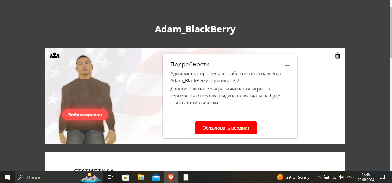 скрин наказания, бан навсегда за 2.2? сначала конечно он в деморган посадил, потом пишет - х очешь оспорить? и дает бан, неадекватно со стороны админа