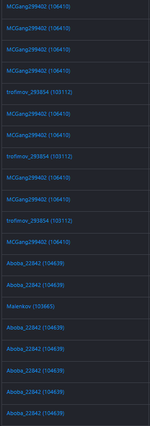 Суть жалобы: Приветствую. Не заходил на аккаунты более месяца двух, из-за проблемой с учебой и отработкой. Хочу зайти и поиграть, вижу что я забанен до 2038 года... Я проверяю личный кабинет и у меня два аккаунта забанены по причине 25пп и неизвестные никнеймы с их видимо айди аккаунтов. Вот эти два: trofimov_293584 и Aboba_22842(104639). Я не знаю, что это означает, но видимо администратор ошибся, пожалуйста разберитесь. Спасибо.