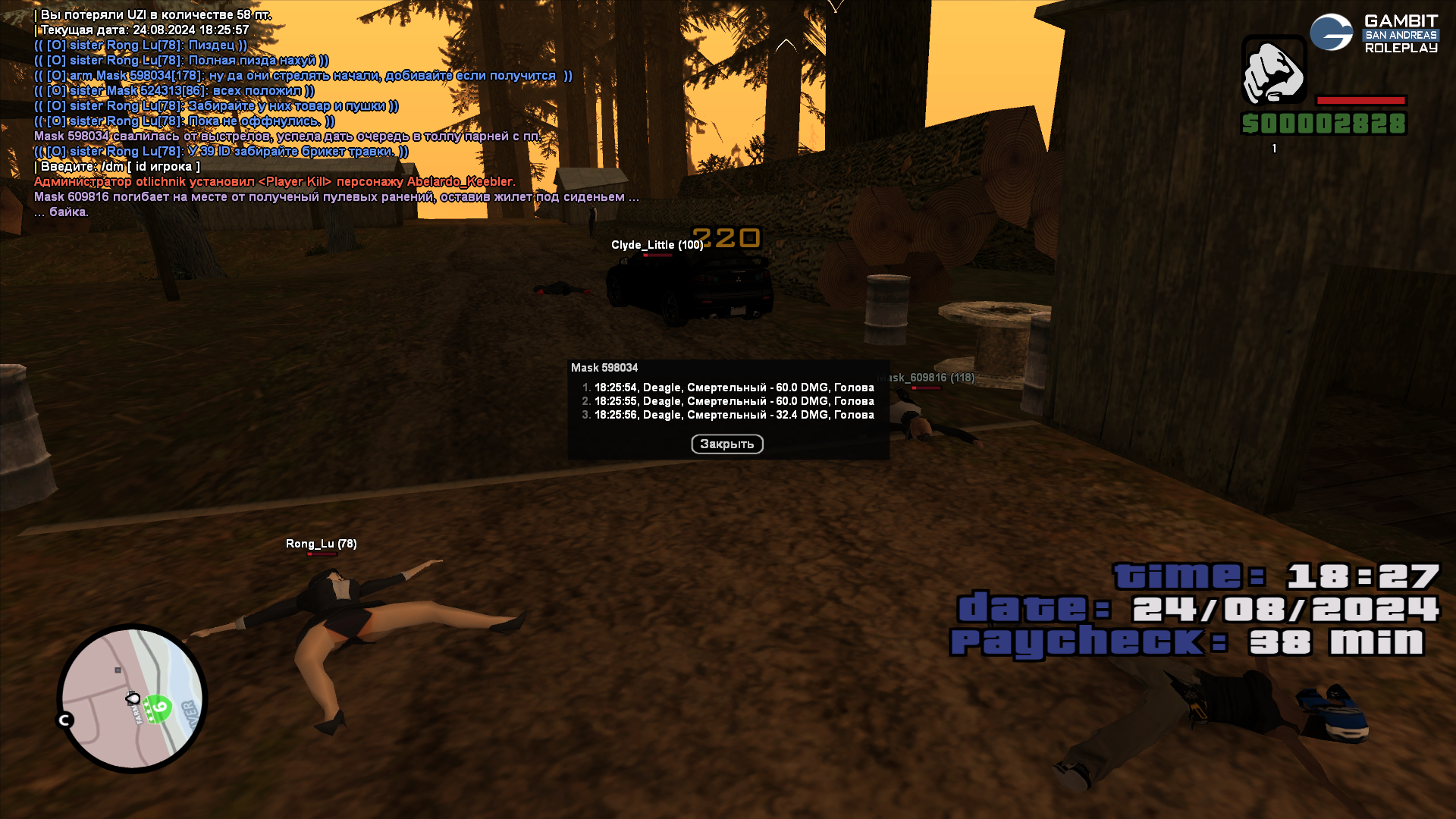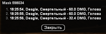 я извиняюсь, что влезаю. но интересно выходит, что ты двоим людям надавал хиты в голову с разной периодичностью во времени и на разном расстоянии. все было ровно в голову, каждый твой выстрел летел именно туда. прилагаю скриншот второго человека, что был на ситуации и слег во вторую именно от твоих рук, получив 3 хита в голову.