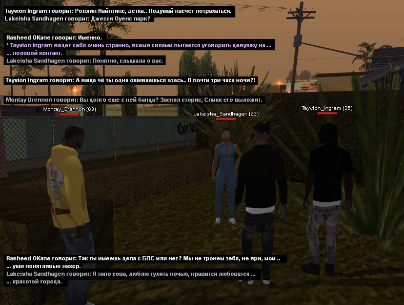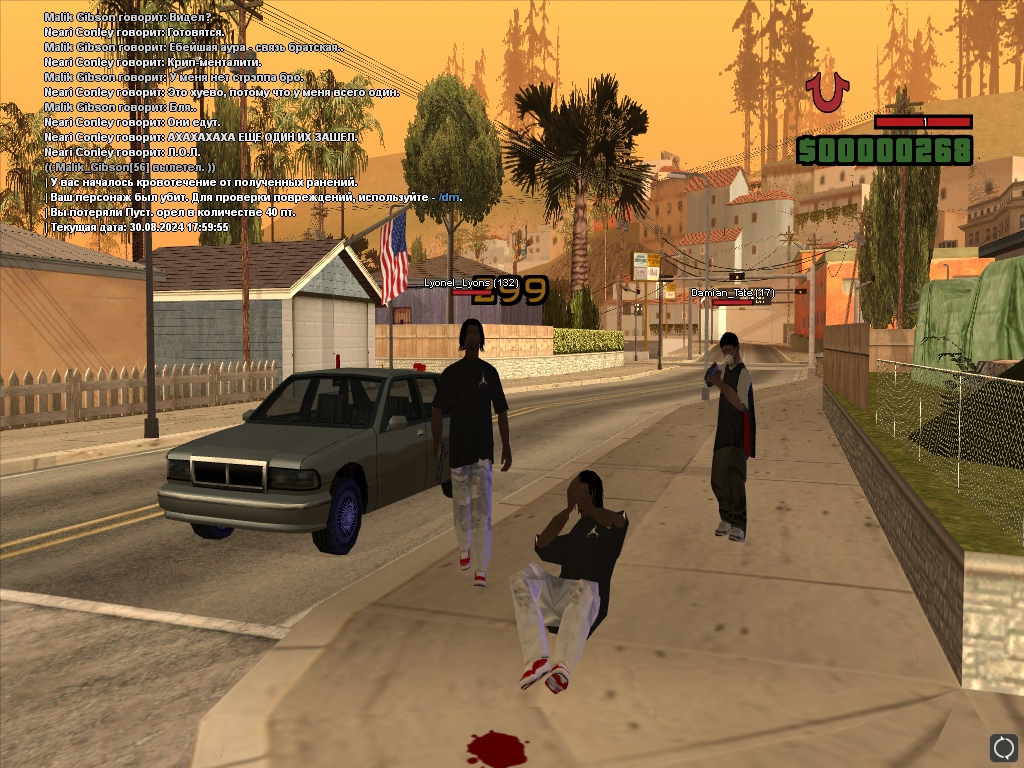 Суть жалобы: Стоял со своим соигроком Маликом, обсуждая темы насущные. Завидев сидящего в машине активного участника банды решили устроить с ним словесную перепалку, типичную для американских уличных реалий - крикнуть пару оскорбительных фраз, попытаться прогнать с тёрфа и тому подобное. Парнишка решил долго не думать, позвав своих корешей через некую социальную суть ВКонтакте, дабы расстрелять нас негодников без отыгровок и с сбивом темпа стрельбы. К тому же за секунд 5 как они к нам подьехали, мой соигрок вылетел из игры после того как попытался открыть свой инвентарь - что было ими проигнорировано (вернее типы сразу стали ныть о якобы КАТАПУЛЬТЕ), и на похуй заебашили меня без отыгровок. Затем, не дав ничего отыграть или сделать Малику - так же захуярили его со сбивом стрельбы без какой-либо отыгровки.