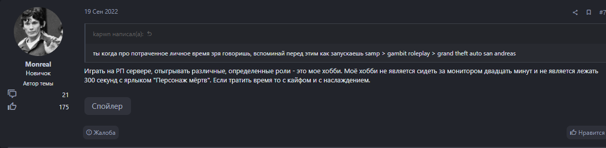 А это разве не симулятор игры? Ты реально играя на хард рп проекте пишешь в форуме для жалоб "сравнить игру и реальную жизнь"? Вот потом ноете что меня товарищи мвдшники убили. Реально иди поспи