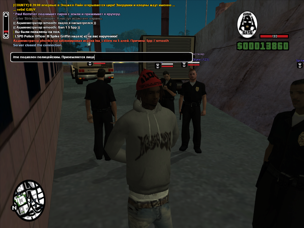 Суть жалобы: Во время погоня столкнулся с крузером на скорости 20 км/ч. Я особо не отыгрывал, так как это и не нужно было, лишь остановился на некоторое время, чтоб ДТП выглядело реалистично. Как только я продолжил движение, админ сразу вмешался в ситуацию, хотя полицейские ничего против меня не имели. Все же я решил, что после столкновения на мизерной скорости машина стала неисправной и начал пешую погоню. Меня повалили и я получаю бан за отказ от игры. Прошу разблокировать аккаунт и провести беседу с некомпетентным администратором. Не удивлюсь, если это хелпер.
