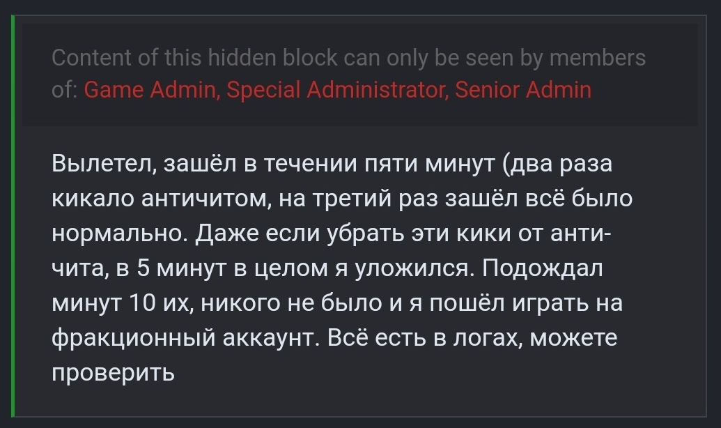 Ну тогда докажи всё это, подкрепи скриншотами. Я же говорю, в логах будет видно что я зашёл, меня кикнуло анти-читом, я после этого зашёл, ждал 10 минут, писал копу Томасу в пм, мне никто не отвечал. До второго пришествия ждать я был не намерен, время часпик, игра во фракции начинаетсяМне нравится это. А почему ты закрываешь это от остальных? Что бы тебя не опровергли? Тебя не было в блоке в это время. Я лично пришел в блок когда ты появился в сети, минут 4-5 побыл ты и снова вышел. я писал репорт на тп тебя к нам, но никто не отреагировал.