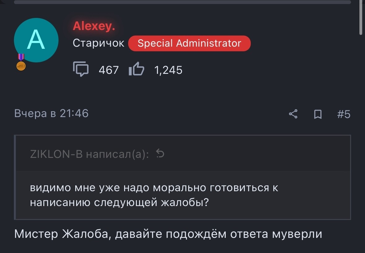 На счёт первого - игрока не устраивало то что все прошлые от него жалобы закрывались с отрицательным вердиктом от Лёши, на что он потребовал сменить проверяющего, однако по иерархии АР, все жалобы на кураторов разделов ЦР, ЮЦП и пр. подобные рассматриваются хэдом АР - т.е Алексеем, отсюда я и написал что по его хотелке ( т.е желанию словом проще ) меняться не будет, и то что в случае неудовлетворения его ответа на жалобу он может пойти выше за обжалованием этого вердикта что он и в праве сделать. Позже к вечеру планировал выкатить вердикт полностью расписав чё и как, но за меня это сделал Лёша. Ничего такого тут я не вижу, я его никак не затроллил, не оскорбил, не угнетал и не унижал