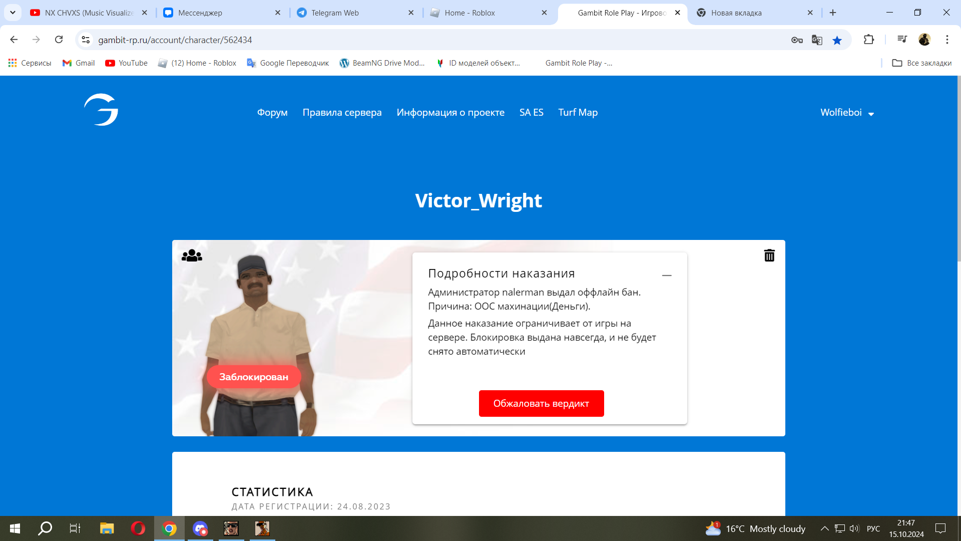 Дата и время наказания/нарушения: 15 Окт 2024