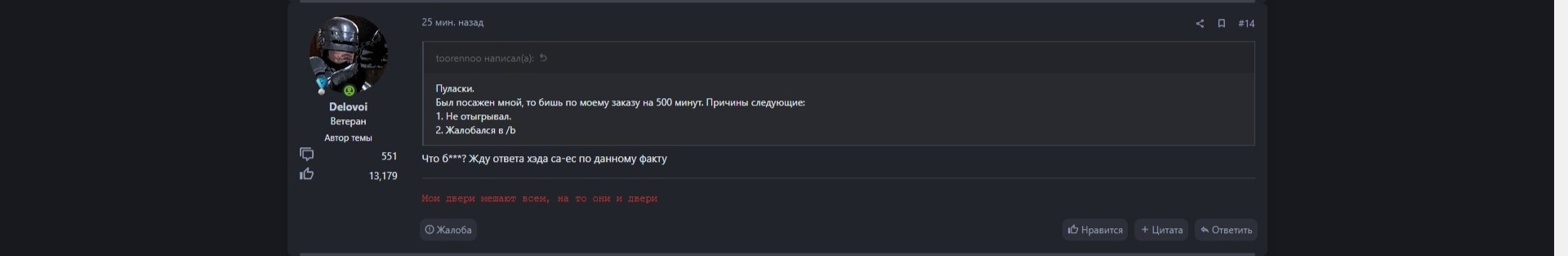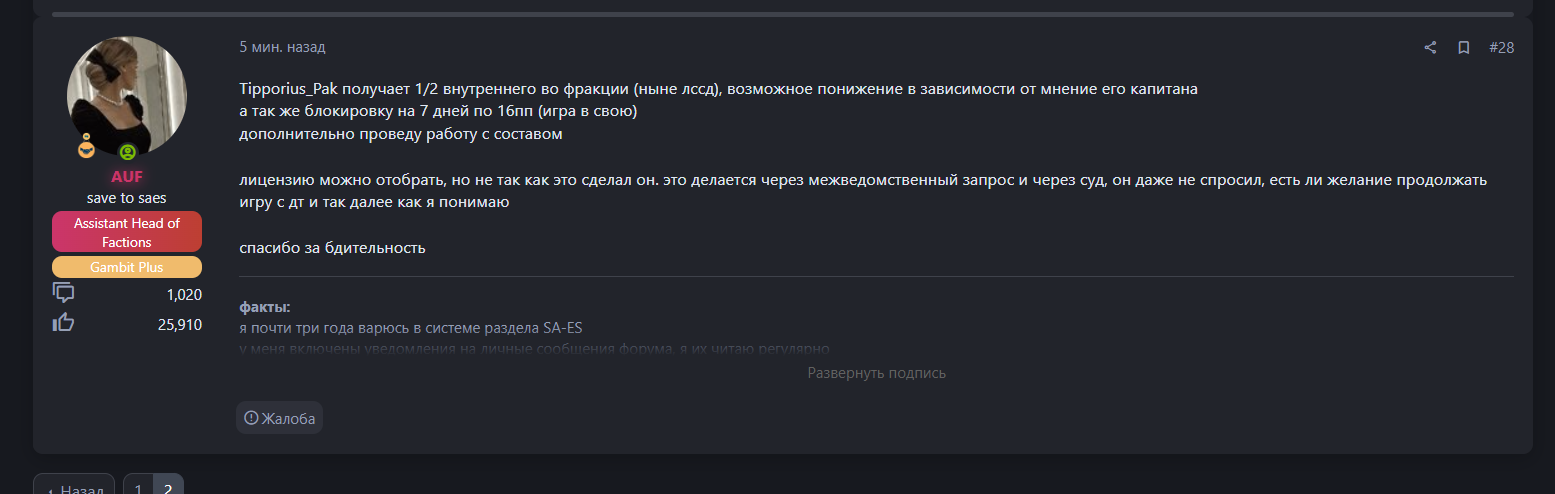Давай ты мне не будешь говорить что, кому, и где расписывать. Я выжил, отыграл ранение по касательной, играл его весь день при взаимодействии со всеми, играл химчистку салона после тонны крови, т.к. хоть ранение и касательное, но даже при малейшем рассечении на бошке - крови выливается достаточно. Играл повязку, и т.д. О каком дальнейшем шоте бандитов речь идет? После этой ситуации я играл вне смены. Не нужно тут за мой уровень игры и за мое понимание раскачивать, малой. Насчет 160хп я хотел расписать большую телегу, чтобы в дальнейшем, при разговоре с тебе подобными, просто ссылаться на это сообщение, и всё, но не стану. У ассистов мой вк есть - перешлю сообщения с хедом саес по поводу моих и моей группы 160хп, тут распинаться не собираюсь. Насчет шкета - я не пытаюсь тебя как-то задеть. Под словом шкет в твою сторону я подразумевал твоё детское поведение в данной жалобе. Жалоба на пацана из спецназа, аргументы приведены, классическая форумная баталия продолжается, и тут возникаешь ты со своим "арррряяяя а ишо воть детективь у вас со 160хп гоняет и ранения не иглает!!!!!!!!!111111".