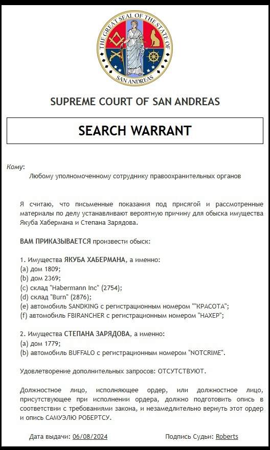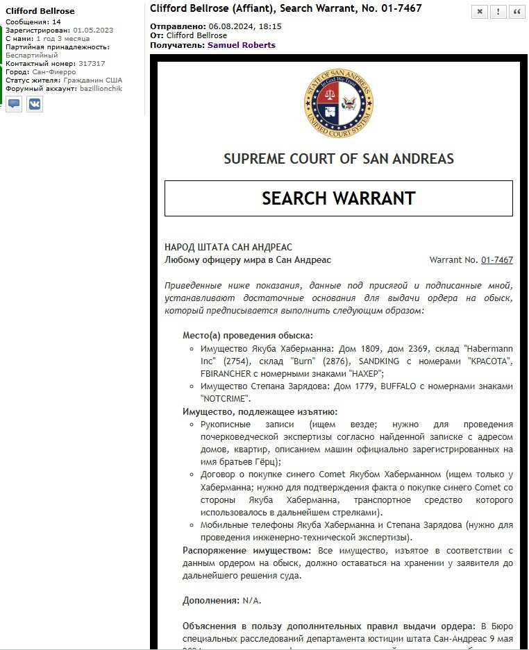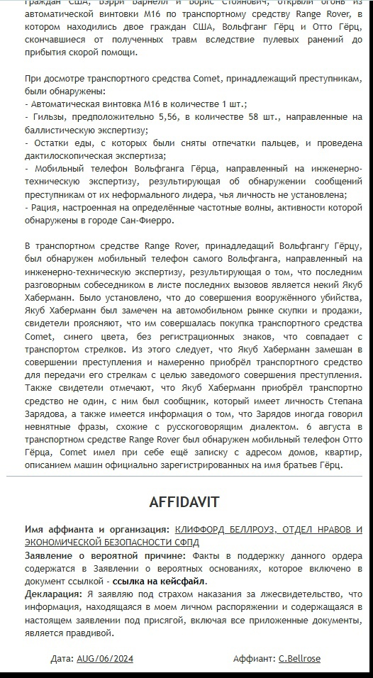 Месяц август – меня уведомляют о том, что по делу снова стали работать. Я связалась с уже вышеупомянутым @bazillionchik , который играл тогда детектива под ником Clifford Bellrose. Мы с ним так же отыграли допрос, прошло всё примерно так же, как и с персонажем Нечаева. По итогу мы договорились в IC и OOC, что дожидаемся назначения суда.