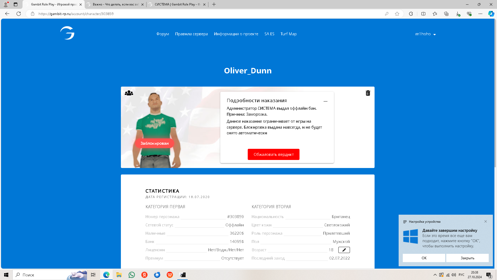 Дата и время наказания/нарушения: (не нашел дату блокировки в лк)