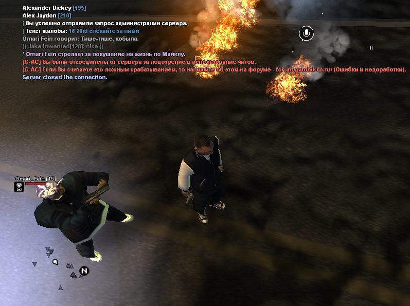 Я не растерялся. Вышел и хитнул одного в стадию. Моя машина взрывается из-за лоу ХП и я отлетаю от взрыва, и системой сервера вылетаю. Захожу спустя две минуты и всё.