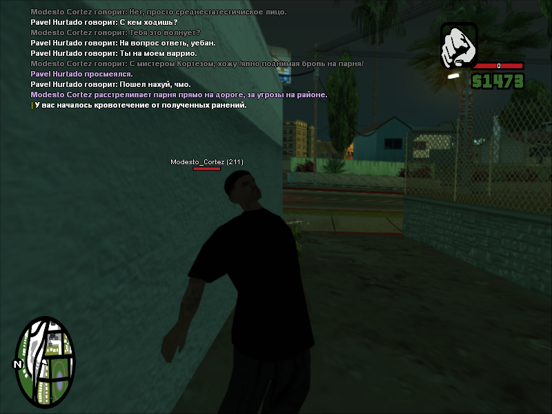 Суть жалобы: Началось все с того, что хотел продать мет данному игроку. Все дошло до того, что я решил спросить с кем ходит Модесто, услышав смешной ответ послал его нахуй. Через пару секунд данный индивид шотает меня по несуществующей причине.
