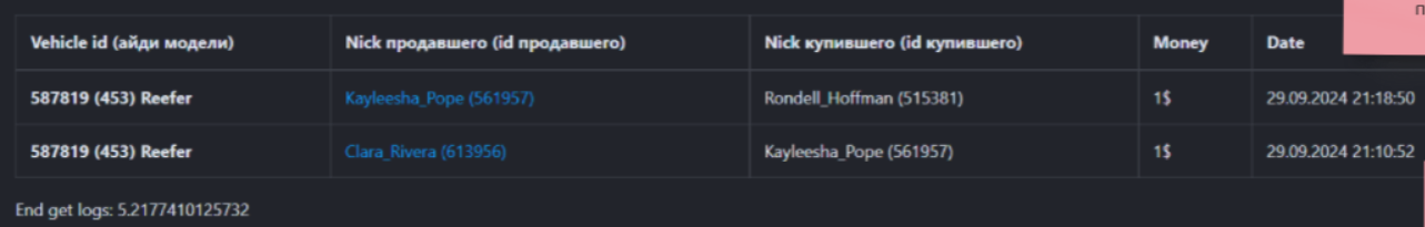 Аа, вы из за продажи лодки меня забанили? Помню что продал какому то человеку лодку но из за того что у того с кем я договорилься не было слотов для транспорта я передал его другу за 1$ и потом он уже дал мне оставшуюся сумму (не больше чем x2 от госа, можете посмотреть по логам)