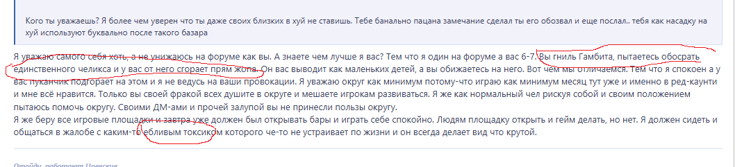 Итог таков - данные игроки нарошным образом пытаются провоцировать игроков в игре, хотя им никто ничего не сделал. Ощущая себя самыми сильными с ганами и 160 хп мешают игрокам спокойно играть в ЗЗ, убивая их и выводя их на эмоции. Я же хочу обратиться к хеду округу потому-что игроки что в игре что на форуме и в вк неадекватные типы и все доказательства у меня на это имеются как и видеофрагменты.