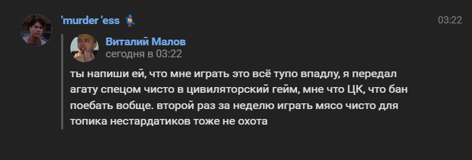 Суть жалобы: Приветствую вас! Сегодня ночью, с моим соигроком-нестандартом решили похитить парочку любителей интернет-знакомств для личных целей (расчленения на сс), но игрок Пьер уже знал о наших топиках на нестандартов и не желал с нами играть, ибо боялся цк - как он сам это заявил мне в пм. Таким образом он решил уберечь свой аккаунт от ЦК, что является крайне плохим поступком бесстыжим. Лишает игру двух красивых перспективных ненаглядных нестандартов, которые тщательно спланировали и уже были готовы выложить его личико как новое снафф-видео на сайте блэклинка, так ещё и директор таггера! Если кратко - игрок всё время бубнел о своём имуществе и о том как нехотел его терять, и что ему бан получить лучше чем цк. Желаем что-бы ему выдали айбан, ибо это уже ни в какие рамки. Насколько я знаю он ещё и ассист, так-что он должен обладать каким-никаким игровым опытом а не наоборот лишать его игроков.