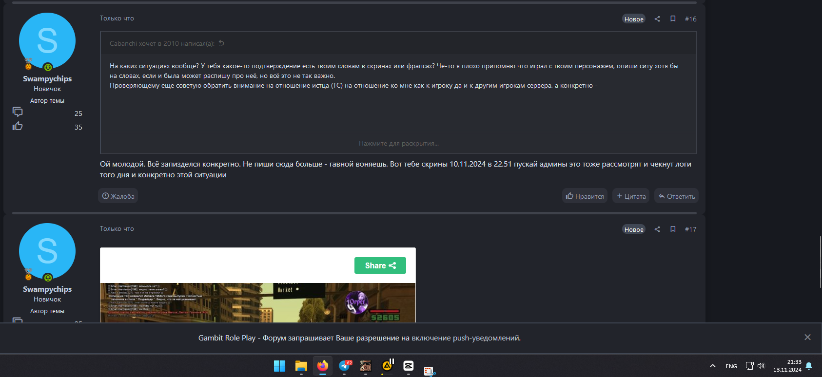 Ой молодой. Всё запизделся конкретно. Не пиши сюда больше - гавной воняешь. Вот тебе скрины 10.11.2024 в 22.51 пускай админы это тоже рассмотрят и чекнут логи того дня и конкретно этой ситуации. Ниже по тексту скинул