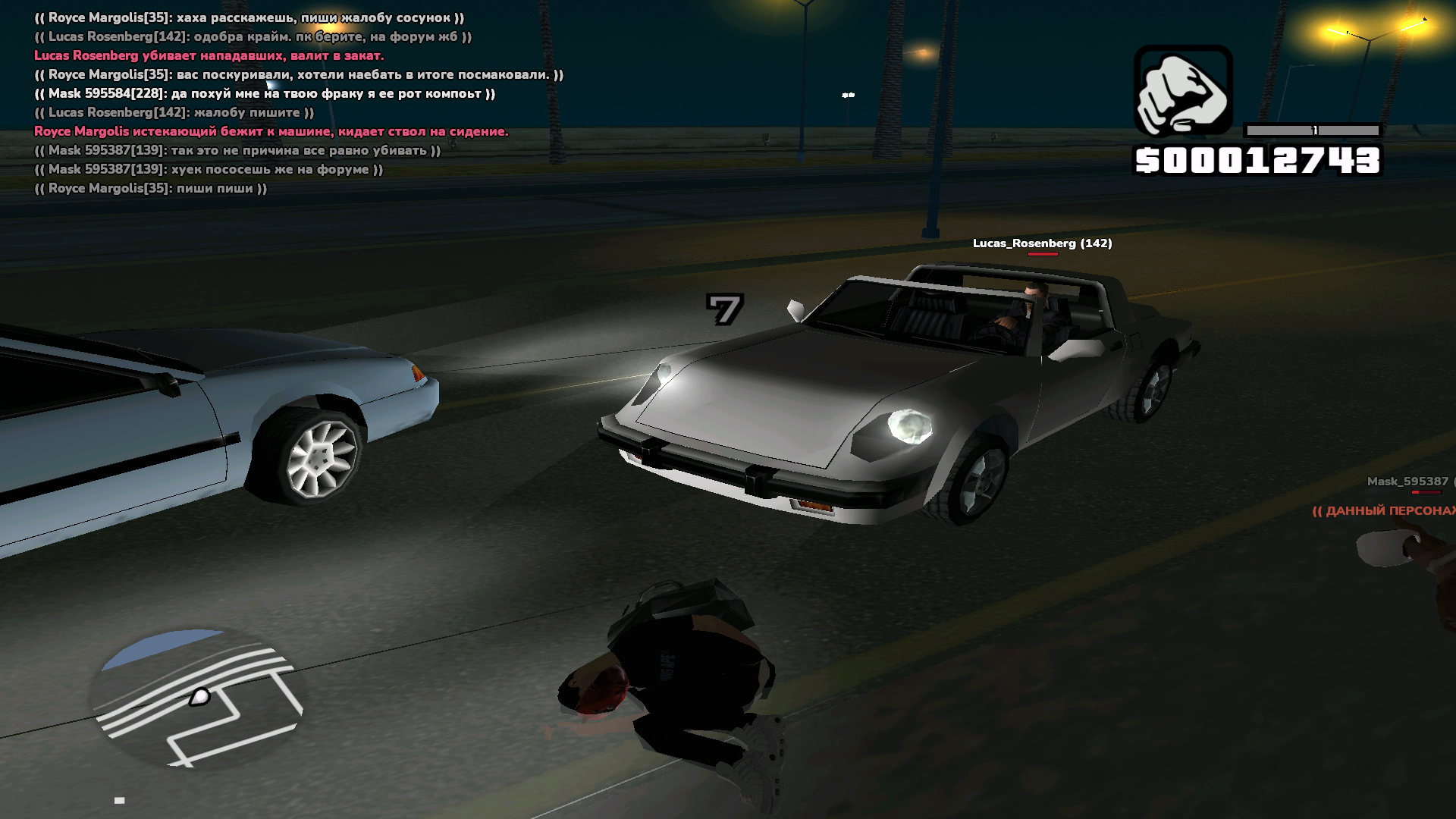 Вы ночью в масках на мотоцикле подъезжаете к моему персонажу, во время когда в игровых условиях у персонажа Ройс , хуйня происходит, далее начинаете просто нести хуету касаемо того, что у меня колесо спускает. Какое колесо, когда только к дому приехал и с машины вылез.