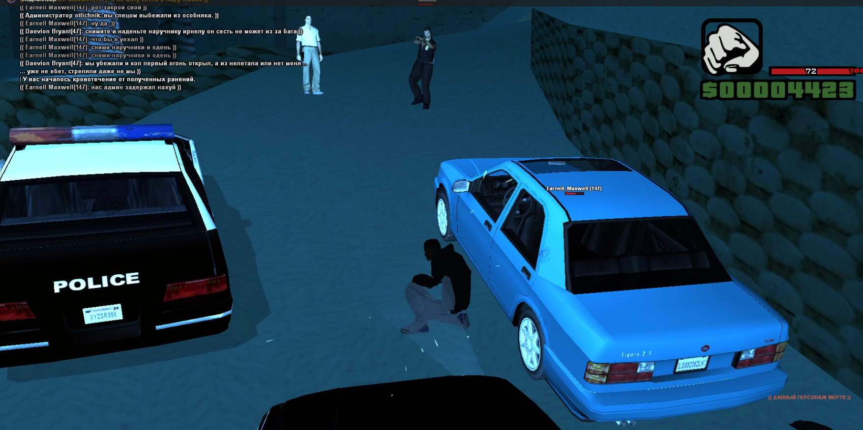 Суть жалобы: была ситуация, в которой пытались задержать нашего соигрока, копв открыл огонь первым, наши парни открыли огонь, убили и убежали, я цепанув ключи пытаюсь уехать отвлекаюсь на сообщения администратора, пока отвечаю ему прибегают копы, я прошу у них фору на что мне вежливо отказывают, я обьясняю что не приделах. Мискликаю W и немного даю вперед - град из пуль. Я демонстративно вылажу и сажусь на корточки показать что я не несу угрозы, хотя мог скрольнуть дигл - но нет, я хотел гейма. После меня убивают и добивают без отыгровок. Как после таких поступков в дальнейшем вести игру с saes, без применения оружия? Я больше чем уверен что жалобу отклонят, но попытка не пытка.