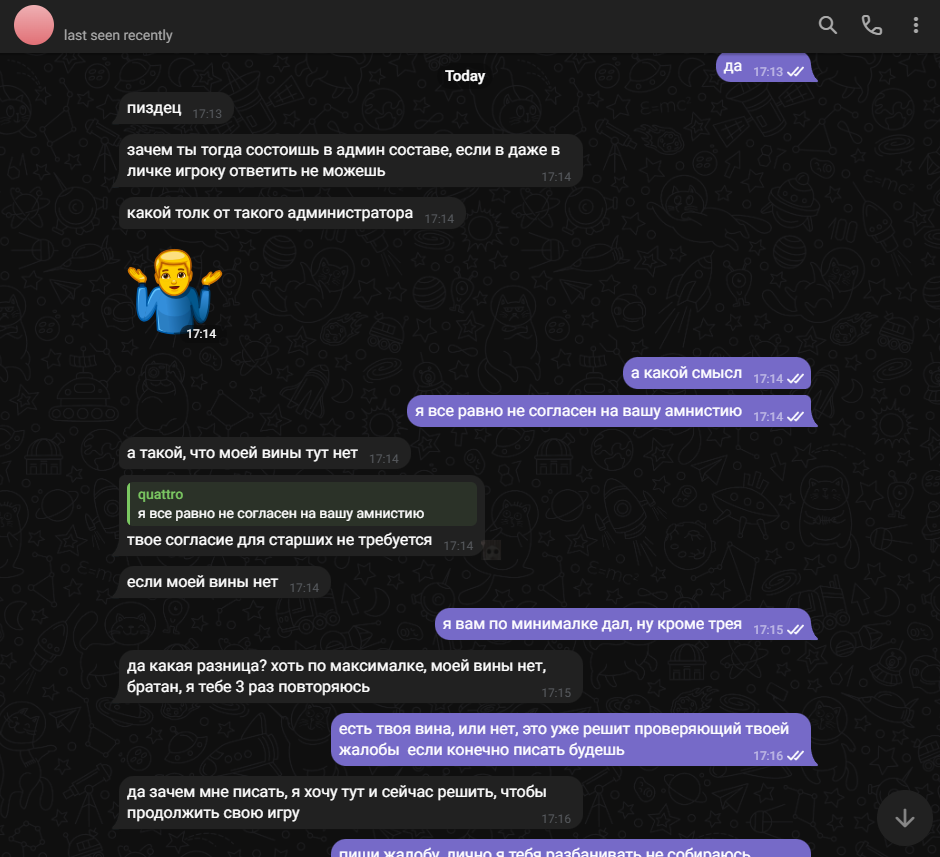 ты этого даже не видел, тот человек был свидетелем того что у меня есть ствол, он запомнил наши лица. Просто признай, тебе не место на админке.