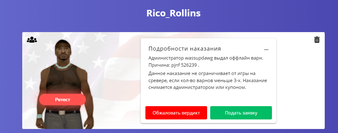 Суть жалобы: не понимаю за что мне выдали ретест, да я ударил игрока прикладом пистолета, далее сразу-же отыграл как держу его ногой на земле, что-бы он не встал, в ответ на это он просто по окончанию своего стана встает и убивает меня с дигла находясь в численном меньшинстве. над головой у игрока появляется /ame с действием, когда человека бьешь прикладом, я не посчитал нужным отыгрывать это в тот момент, все и так всем было понятно. считаю что я ничего не нарушил и прошу разобраться.