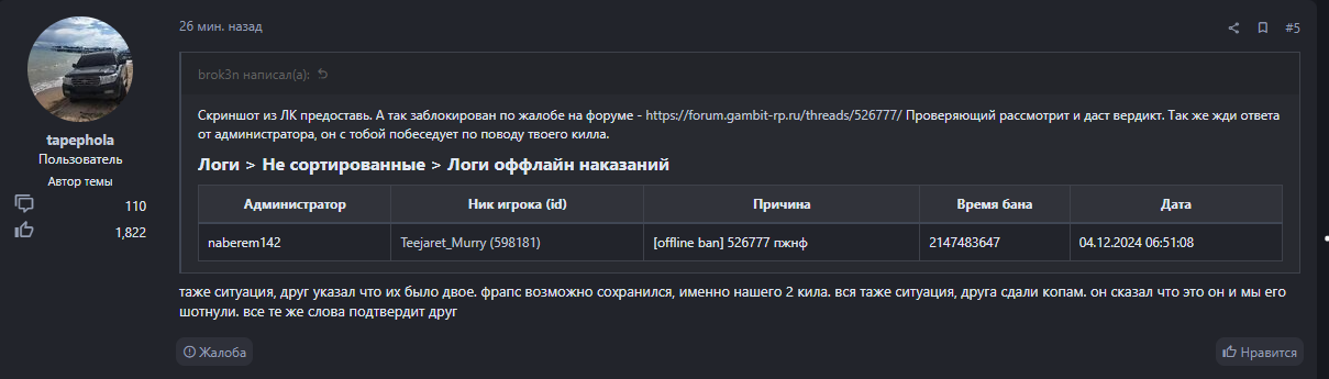 Суть жалобы: Вечером третьего числа я после того как наигрался со своими друзьями, мы разошлись, я просто зашел в ескейп, ну типо в афк, пошел себе похавать сделал, полежал посмотрел видосов и рубанулся. Утром к компу не подходил, ушел в шарагу. Пришел, сажусь за комп, включаю моник, смотрю у меня гташка открыта оказывается, захожу что бы через /rec перезайти, ведь очевидно что меня должны были кикнуть за неимоверно долгое афк которое длилось 7-9 часов. Захожу в общем то, а меня вместо оповещения об отключении от сервера встречает надпись что мне выдан плеер килл и вокруг меня, судя по чату обыграна целая ситуация, в том числе с моей смертью. Самый главный аспект что я потерял оружие которое лежало у меня в активном слоте. В первый раз сталкиваюсь с такой ситуацией, хотелось бы подтянуть того кто меня убил, того кто выдал плееркилл, откатить убийство и вернуть утерянный пистик. Так как откат у меня работает только на игру, а не на раб.стол, соответственно на откат попала лишь моя реакция на это всё - единственное доказательство с моей стороны.