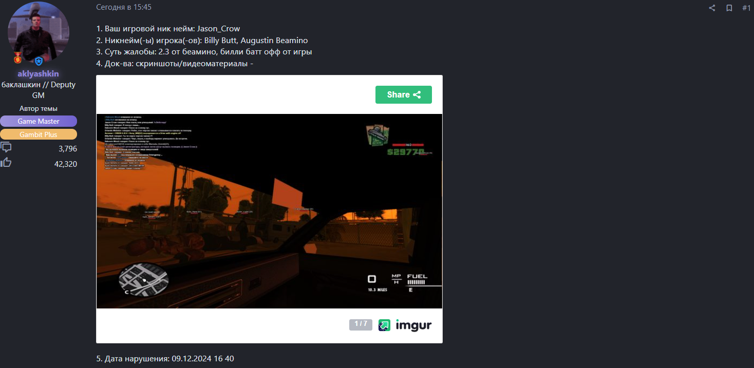 Можно сюда док-ву игрока, который написал жалобу, там у него должна быть отыгровка стрельбы, он первый начал стрелять просто и отыгровка подтвердила бы это