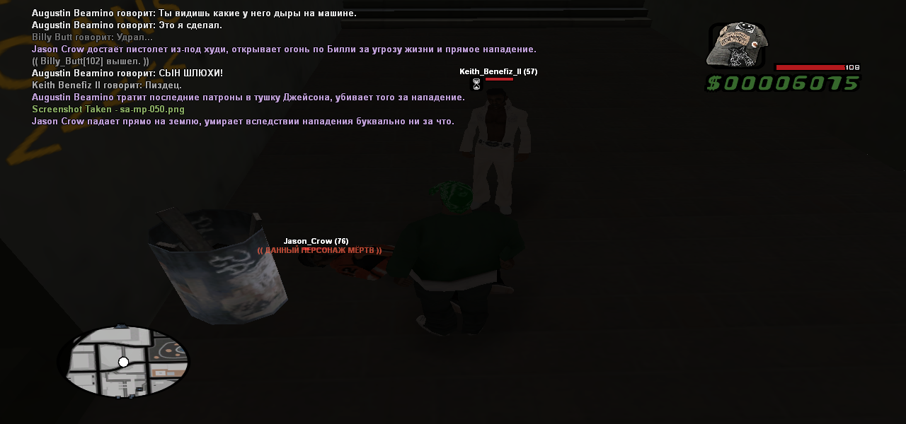 И где от меня 2.3? Парня начали грабить в автоподставе, он дал по газам таща на бампере нашего друга общего. На приказы остановится он не ответил, пришлось прострелить ему колеса и немного ранить в голову, ничего из этого парень не играл, побежал с места. в конце выхватил дигл и пытался меня убить, но я его опередил. Щас докину скрины от себя.