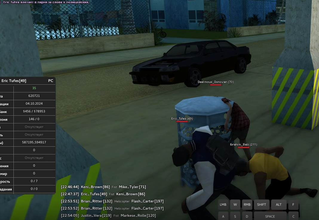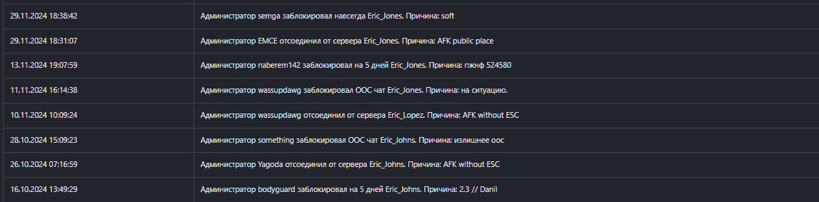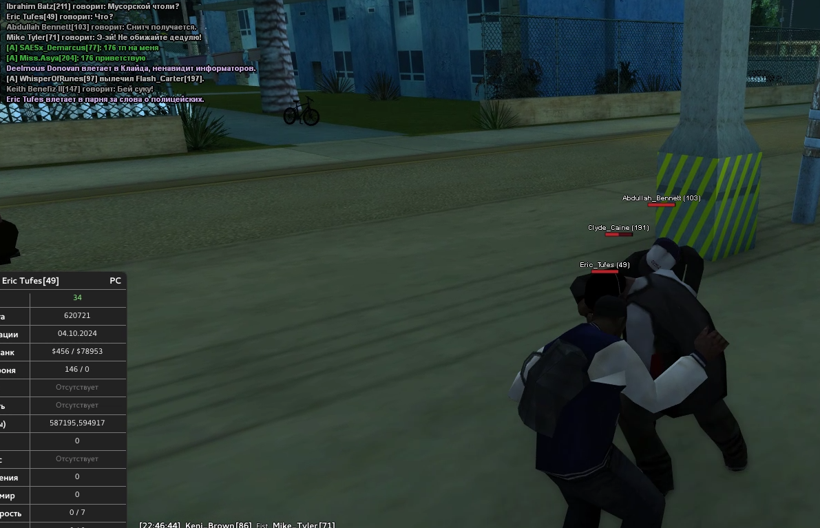 интересно выходит, по квенте твой персонаж в принципе драк избегает и не любит их, однако в игре при первой же возможности ты хвастаешься своим стилем боя и врываешься в любой файтинг при любой возможности, в последовательности обыскивая карманы неугодников. играешь в компании нарушителей и фангеймеров, а потом удивляешься блокировкам и расписываешь какой-то бред про какую то ''неприязнь''. также имеешь еще несколько аккаунтов с аналогичным именем, в том числе точную копию аккаунта эрик тюфес с припиской младший, на которых занимаешься таким же бредом. @aedadai решать тебе. 🤙