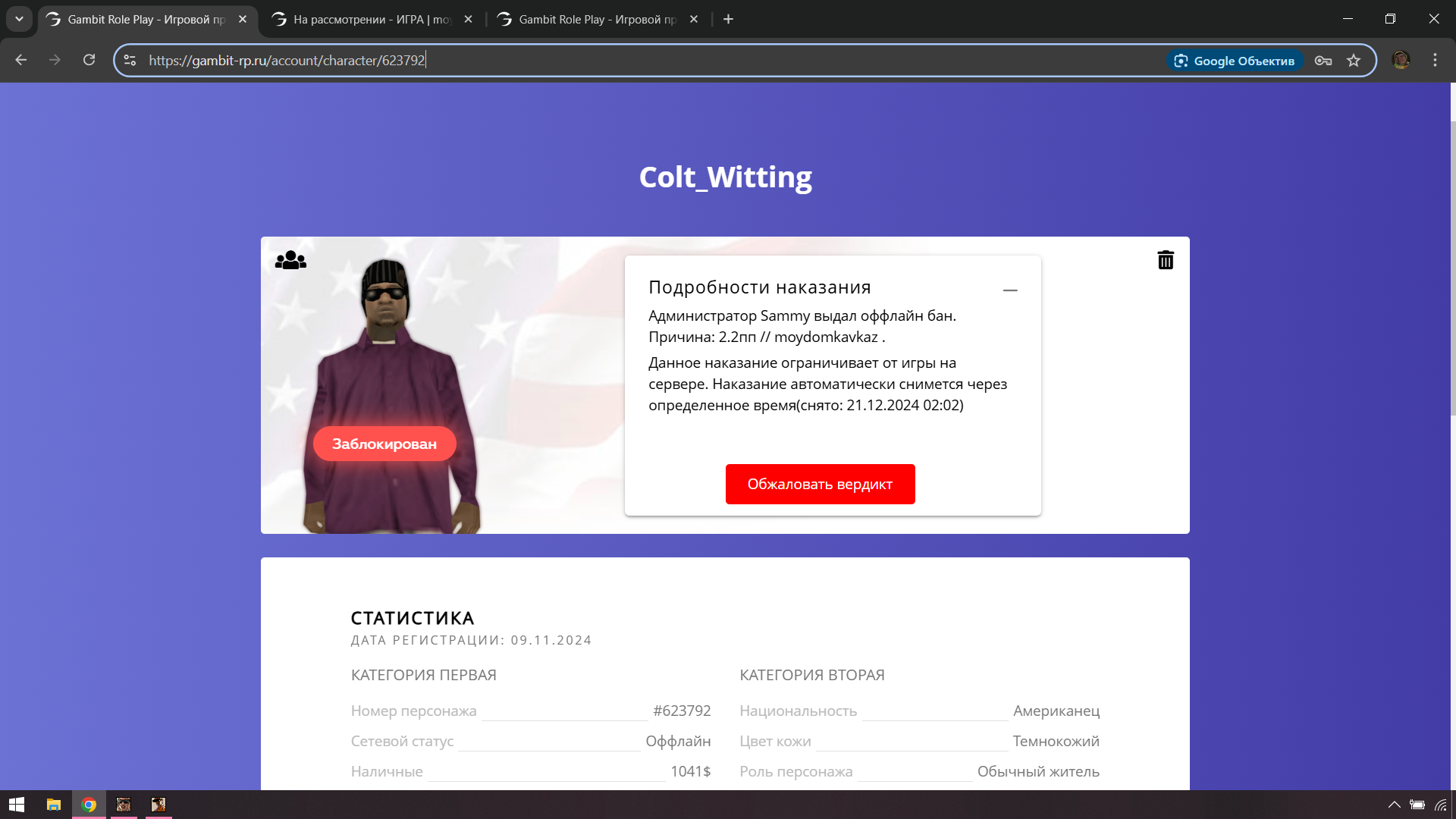 Суть жалобы: Я каюсь что был не прав и обещаю не повторять нарушение,прошу рассмотреть возможность амнистий моего персонажа.
