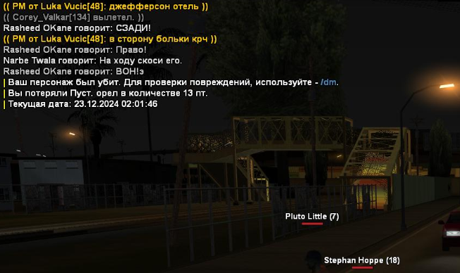 Была сделка на оружие, более трех обрезов, и трех пистолетов, не мало знаете ли, стоит на углу красная машина внутри которой был друг данного человека, который подслушал и тем более нам сказали что он Коп, дальше за ним поехали и поставщика и его друга мочканули, мы поехали за кентом и убили его за то что он свидетель, думаю 2.3пп это объясняет. И мне очень жаль, что твой дружок с читом, за 5 секунд положил 3 человек и без одного промаха. А насчет скрина, так я написал ему где мы едем, тем более мы стоим у ЖДЛС, а на скрине видно что я сказал что мы у больки едем, не было инфы где вы стоите.