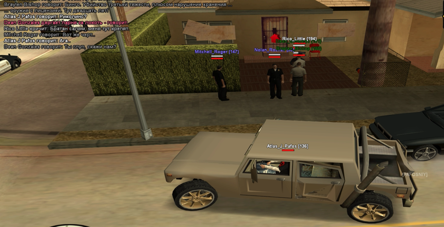 Суть жалобы: Поступает вызов на Айделвуд, что как-то мужик сидит возле дома с ружьем. Мы приехали, завели беседу и началась у нас игра с Rico Little, проверили карманы его и ПД пошли проверять по базе (на откате будет видно как я листаю чат, хотел найти сам вызов но чат улетел вверх). Вроде играем спокойно и адекватно, но потом получаем все дружно очередь с АК в спину. Суть: хочется увидеть отыгровку стрельбы с АК по нам, по какой причине.
