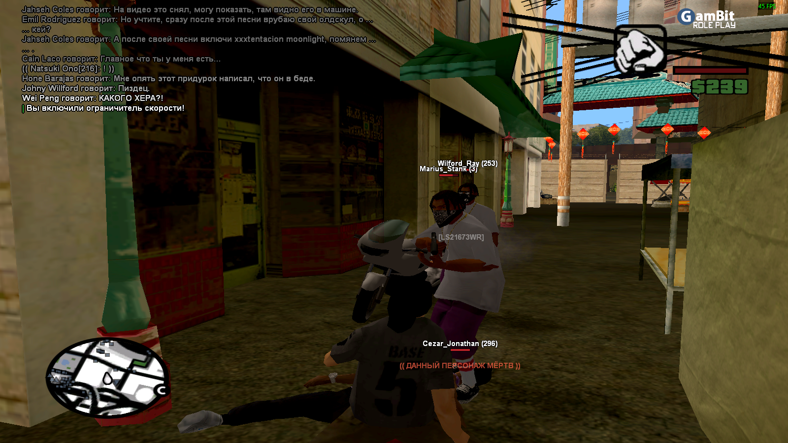3.Суть жалобы: Приехал на Чайнатаун, смотрю, лежит парень в стадии, отыграл, слез с мотоцикла и тут же вылетает второй мотоцикл с двумя парнями, один из которых ни за что ни про что меня убивает, действуя без веских на то оснований, то есть попросту ДМит. Апеллирует это тем, что "ну друзья же, реакция такая". Считаю, что игрок явно превысил свои действия по поводу убийства, в этом не было совершенно никакой необходимости, тем более если учитывать, что Чайнатаун довольно плотно населен и парень стрелял по сути при скоплении людей, после чего еще некоторое время находился у двух трупов. Ко второму претензий не имею, т.к. он был просто водителем, с ним, в случае одобрения жалобы на первого, буду обыгрывать ИС путем через камеры, обратившись в полицию.