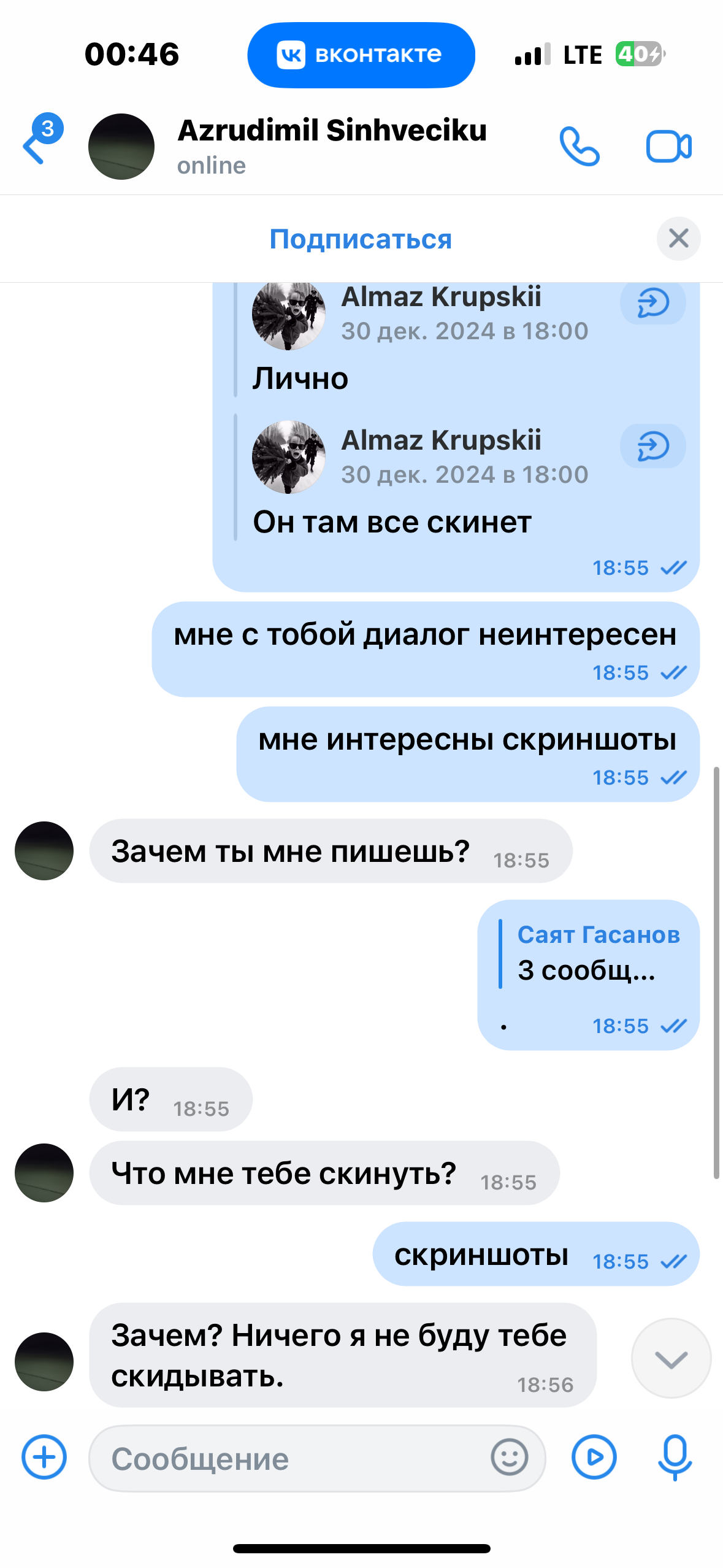 это лишь доказывает твою непрофессиональность и явно указывает на то, что тебе рано выдавать какие-то админки в игре, ты строишь вокруг себя зону комфорта и блокируешь игрока не связанного с твоим профилем и сферой игры. То, что тебе что-то не понравилось в моей игре лишь указывает на твое нежелание взаимодействовать именно со мной. А то почему-то в другие дни вы не брезгали перестреливать полицию, но именно когда тебя кафнули и у тебя куча наркотиков и оружия в инвентаре, ты решаешься выдать блокировку.