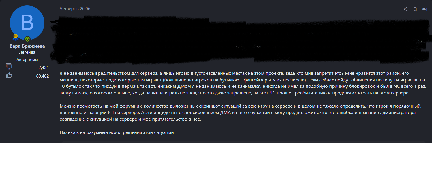 Может я не прав, но я все отыгрываю и стараюсь грамотно это делать. Если я нарушил правило, то признаю это, в целом это видно в сути жалобы. Если есть возможность простить меня, то пожалуйста. Я всегда соблюдал правила сервера и делал серьезную ролевую игру, думаю, можно хоть раз обойтись без бана