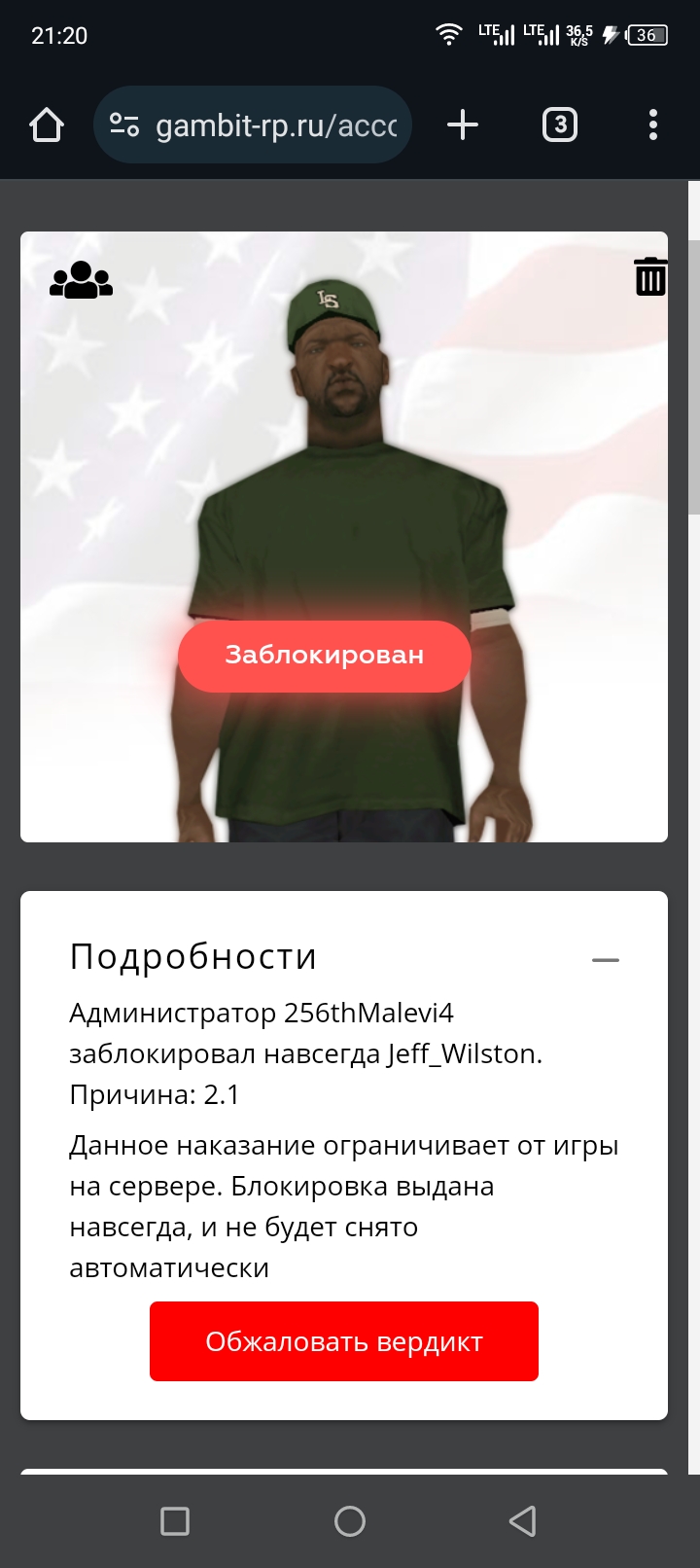 Суть жалобы: Не пойму за что бан навсегда? Я же тупо сел на велик друг кинул покупку велика я пока его покупал сбил человека ехав вперёд, ладно то на дней 3-5 но НАВСЕГДА это уже перебор. Ты вроде бы в реальности не получаешь пожизненное за то что наехал на человека на велосипеде.