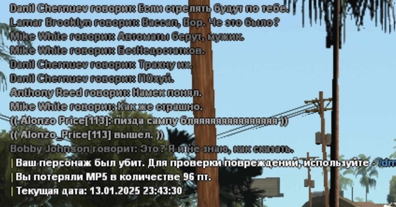 Проезжая по ночному Лос-Сантосу, мы встретили одинокого барыгу, стоящего в /deal, что уже была как красная тряпка для быка. Ну мы и подъехали доебаться и раскрутить лоха на наркотики, сторговав цену. Во-время диалога выбежали его друзьяшники, мы начали уезжать, а он зачем-то оскорблять нас в след. Мы решили не попускать, попросили спокойно его извиниться, на что прибежал местный оу джи, которому я спокойно пытался объяснить, что мы хотим извинения и уедем, так как никто не оскал его. ЧСВ ребёнка на местном оуджи подумало, что у него много духа, продолжил кипеть и решил закинуть мне удар в челюсть, когда мой персонаж находился в машине. Разумно было бы предположить, что раз он смог дотянуться до моей челюсти(если хоть раз кто-то дрался с типом, который сидит в авто), то схватить его за яйца это нормальная идея, в условиях США, где нет такого понятия по-пацански это будет или нет. Оуджи начал свистеть, IMG_0677.jpeg
