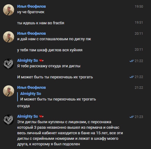 Ну и напоследок мои слова о том, как я отношусь к продаже и покупке оружия за рубли. Я никогда не покупал блять оружие за рубли и у вас даже нет моих слов о всяких покупках и продажах, потому что я их не совершал блять никогда. Если бы я чем-то подобным занимался, то у Нумпелело, который был с нами довольно давно были бы какие-то мои слова об этом, где я интересуюсь кто продаст или где купить или чето в этом роде. Как вы видите, нет, не интересовался и оружие на деньги никогда не обменивал. Здесь мной перечислены единственные моменты передачи мной или мне оружия, которые не нарушали правила проекта. Да, я без условно мог кому-то плохому передавать наркотики, деньги там какие-то на вход в бизнес, на починку авто, мне так же могли какие-то мелочи передавать, но это всё была помощь моим IC друзьям, ООС дела которых моего персонажа вот вообще никак не касаются и я не понимаю если честно какую вы тут связь видите с продажей оружия за рубли.